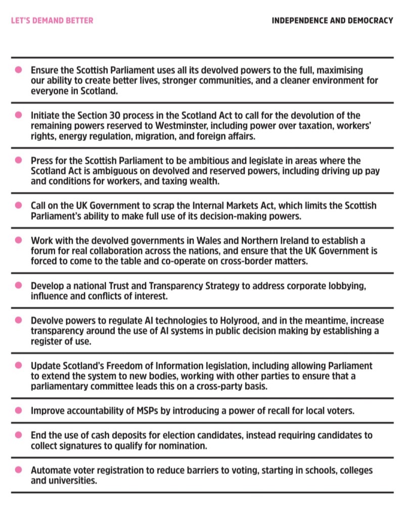 Unsurprisingly, the Greens reaffirm their commitment to independence, linking it with their wider policies on democracy in one clear section. Notably the party doesn’t even mention a referendum but calls for the devolution of foreign affairs.