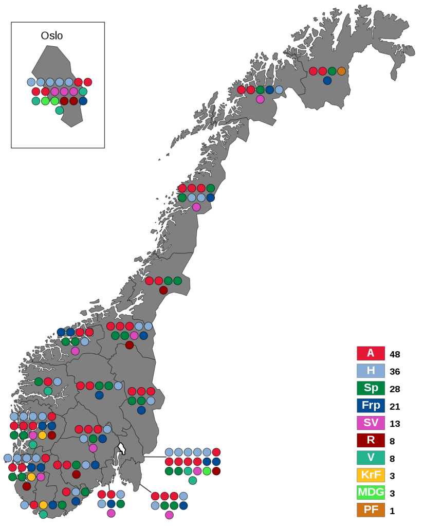 After eight years of a Conservative-led government, Norway has voted for a change. The Labour Party may have lost seats in this election but PR means that government formation is not about who is the biggest party. Instead Nowegian parliaments accurately represent how people vote with governments formed by whichever coalition of parties can command a majority in the Storting. In this case, the governing right-of-centre parties lost seats overall while the left and centre made gains. All in all, the distribution of seats fairly reflects votes cast at the ballot box.